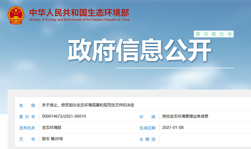 《关于废止、修改部分生态环境规章和规范性文件的决定》已于2020年12月25日由生态环境部部务会议审议通过,现予公布,自公布之日起施行。